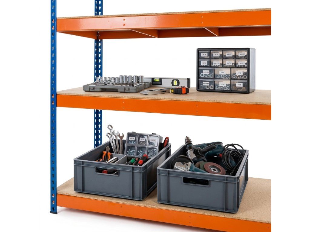 Extra široké police umožňují ukládat dlouhé předměty nebo naskládat více přepravek vedle sebe, což šetří čas při hledání materiálu.
