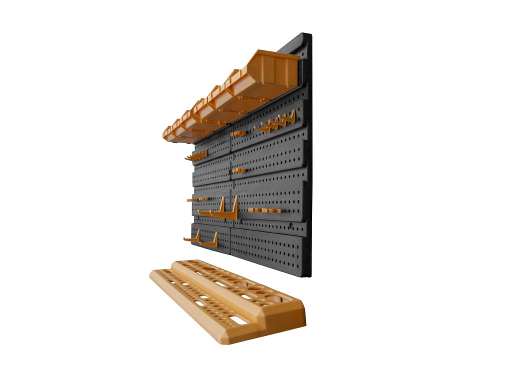 Chcete mít v dílně nebo garáži pořádek a přehled? Tento nástěnný panel nabízí praktické řešení pro uložení nářadí i drobného materiálu. Díky kombinaci plastové tabule, držáku, boxů a háčků budete mít vše na očích a vždy po ruce.