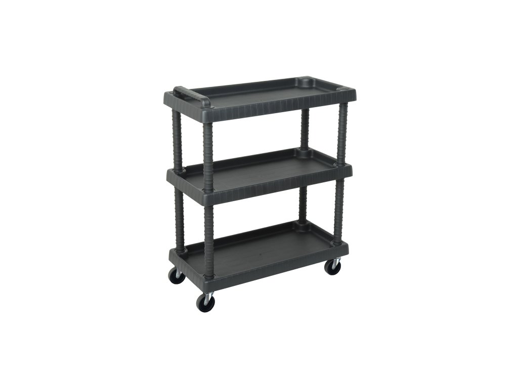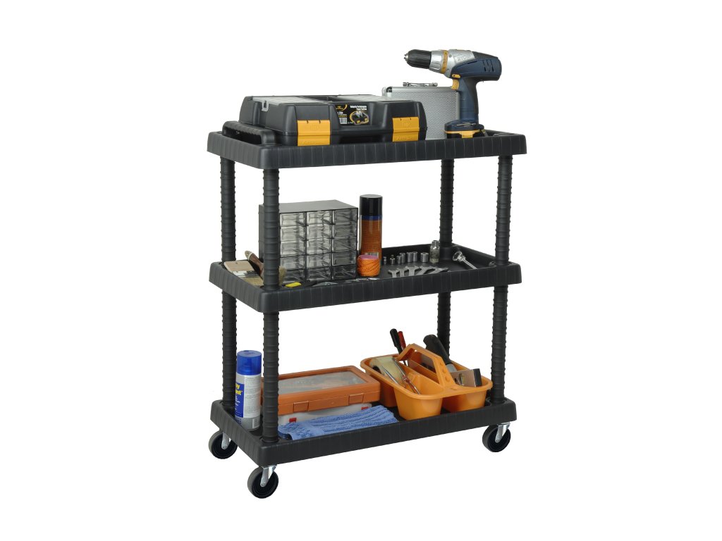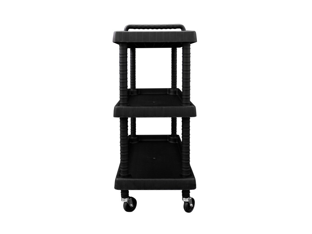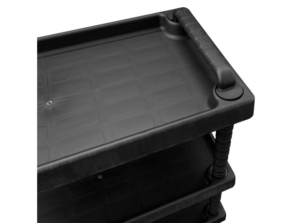 Černý plastový pojízdný vozík s nastavitelnými policemi