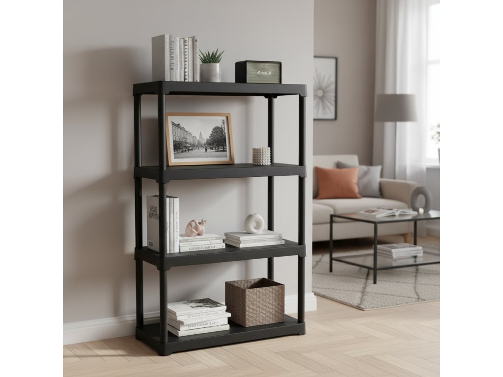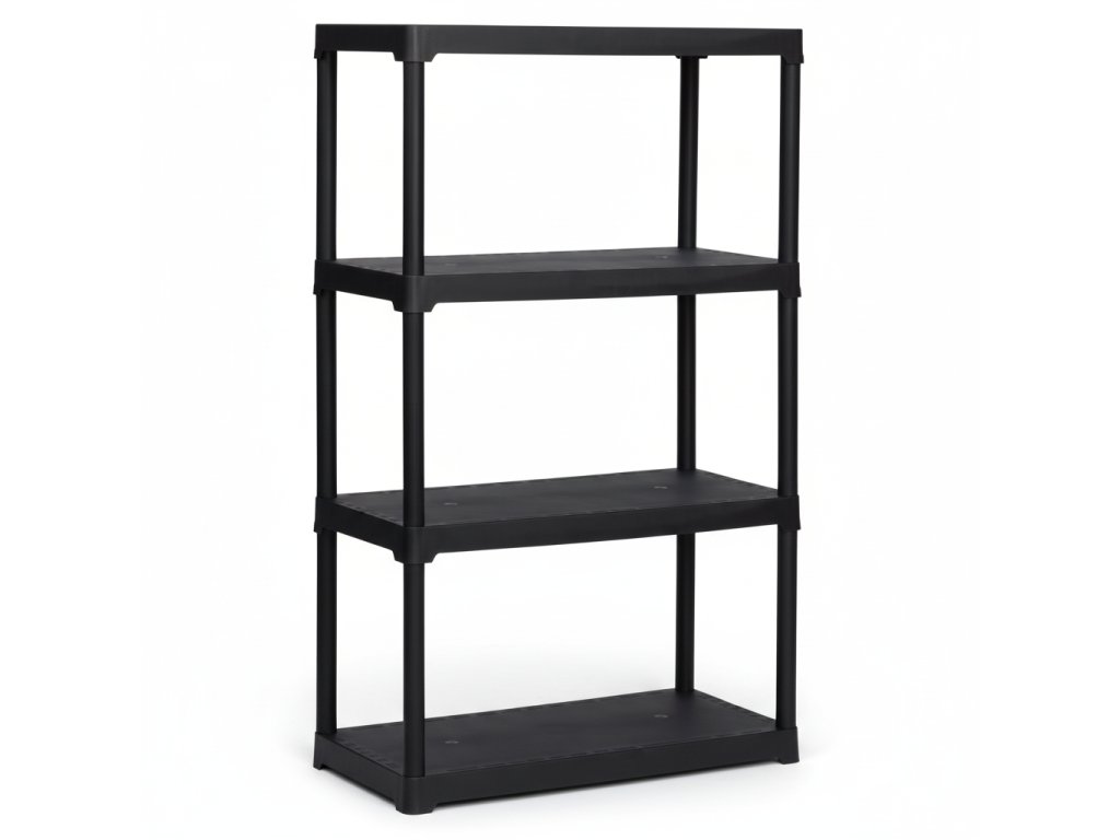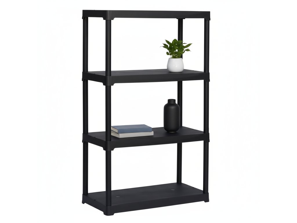 Černý plastový regál se čtyřmi policemi