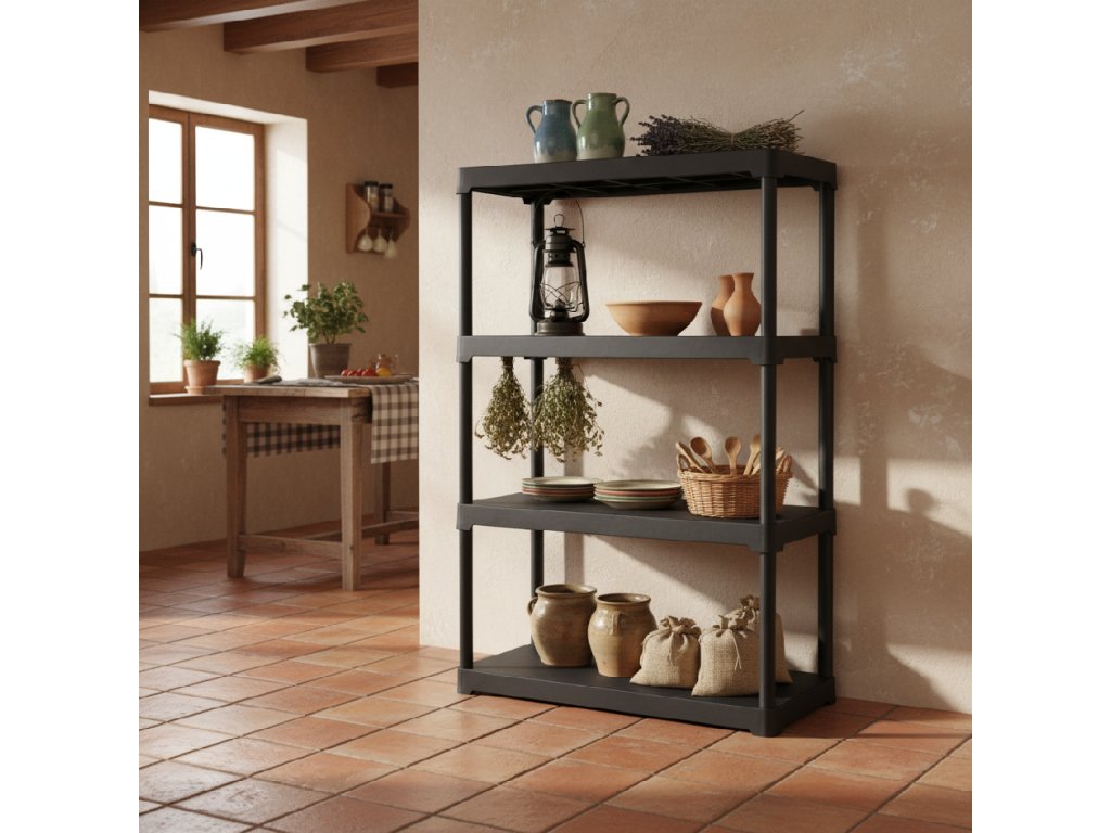 Černý plastový regál je stabilní a prostorný. Díky větší šířce i hloubce nabízí dostatek místa na větší předměty. Systém zacvaknutí umožňuje rychlou montáž a odolný plast zajišťuje snadnou údržbu i dlouhou životnost.