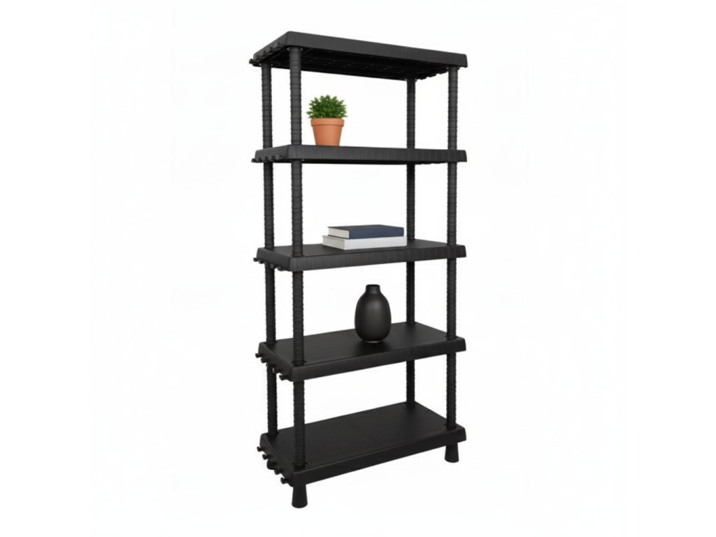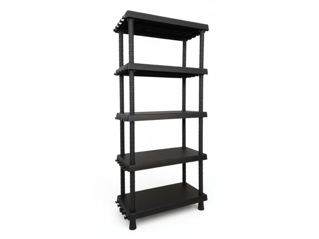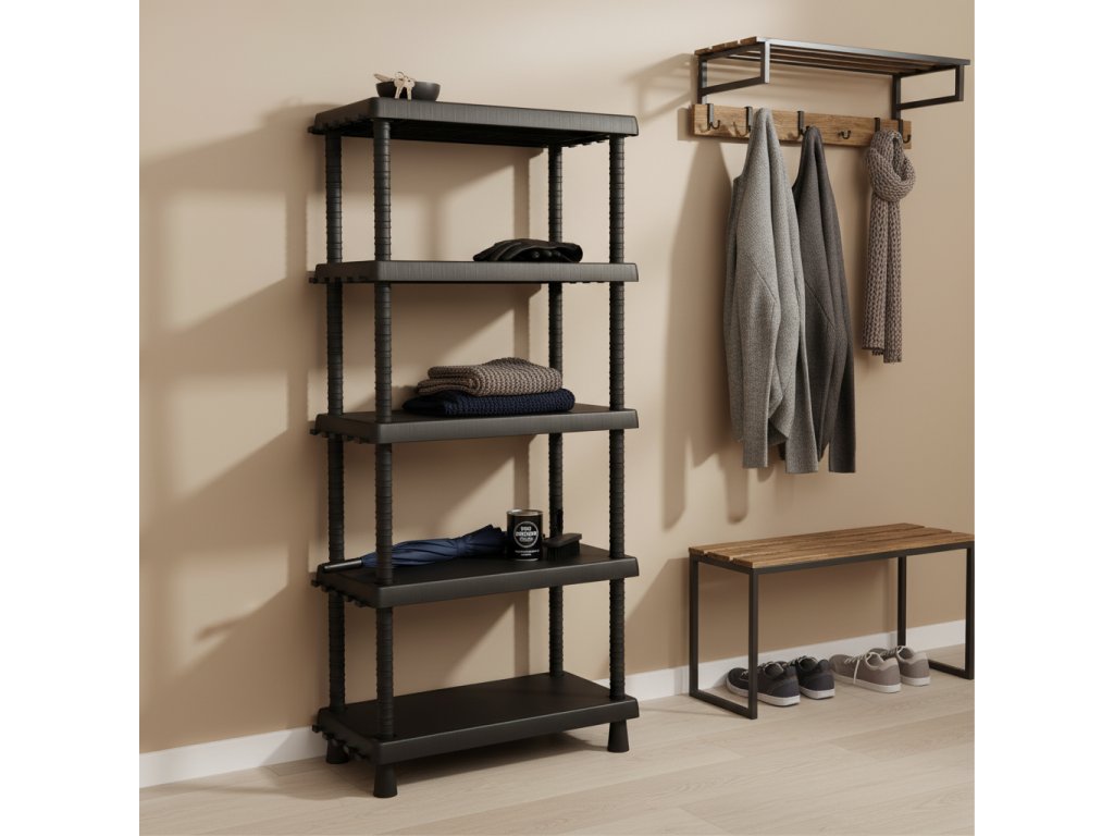 Černý plastový regál s nastavitelnými policemi a háčky