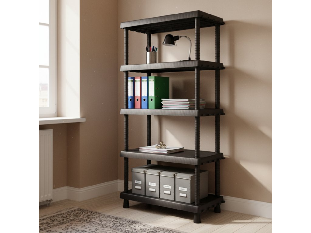 Černý plastový regál s nastavitelnými policemi a háčky