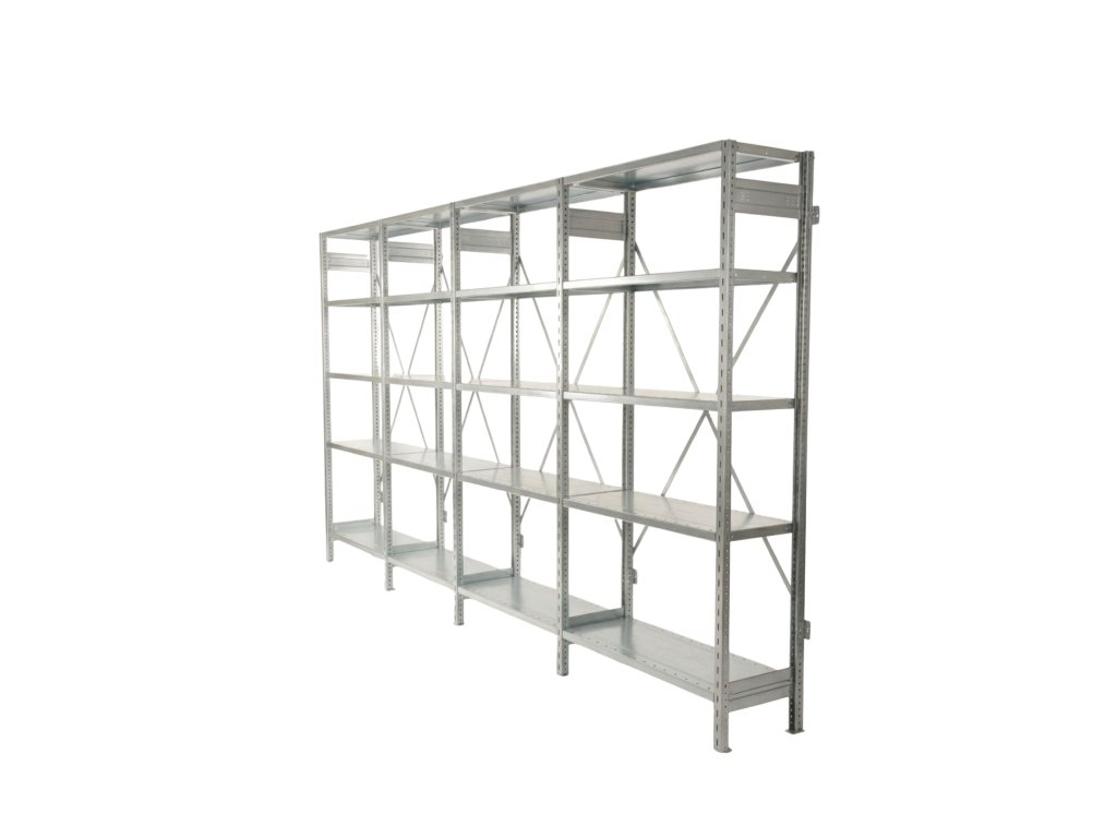 Stojiny z pozinkovaného plechu s profilem 35×35 mm zajišťují vysokou pevnost, stabilitu a dlouhou životnost regálu.
