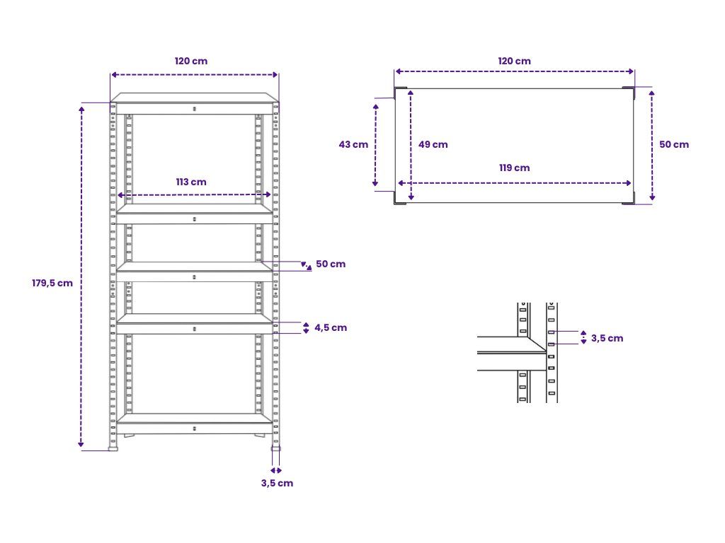 Vysoká stabilita a nosnost nejsou dílem náhody. Jsou výsledkem kombinace precizního profilování oceli, přesných spojů a středové výztuhy pod každou policí. U polic této šířky (120 cm) je pro minimalizaci přirozeného průhybu klíčové rovnoměrné rozložení zátěže. Jsou ideální pro skladování v boxech a pro objemné, rozměrné předměty.