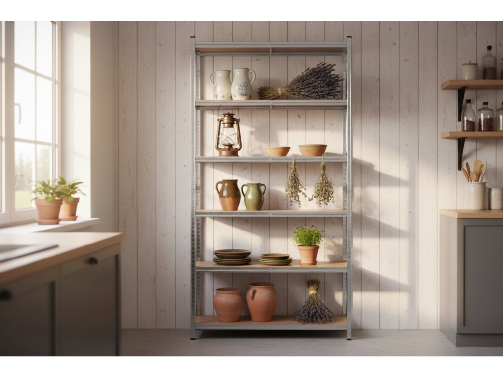 Pro pohodlný a bezpečný přístup k nejvyšším policím regálu vysokého 240 cm budete potřebovat stabilní domácí schůdky nebo štafle. Horní patra jsou ideální pro dlouhodobě skladované věci.