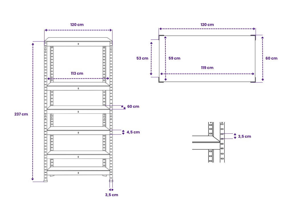 Vysoká stabilita a nosnost nejsou dílem náhody. Jsou výsledkem kombinace precizního profilování oceli, přesných spojů a středové výztuhy pod každou policí. U polic této šířky (120 cm) je pro minimalizaci přirozeného průhybu klíčové rovnoměrné rozložení zátěže. Jsou ideální pro skladování v boxech a pro objemné, rozměrné předměty.